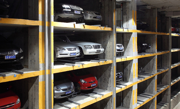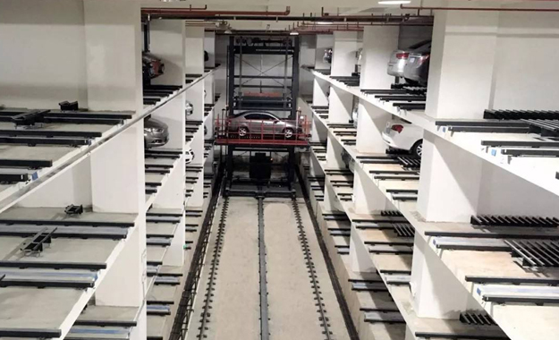 在兩側(cè)泊位的中央設(shè)有巷道堆垛機(jī),整個(gè)車庫的運(yùn)行均由堆垛機(jī)和搬運(yùn)器來完成。汽車入庫時(shí),汽車停在出入庫臺(tái)上,堆垛機(jī)從出入庫臺(tái)上取走汽車后在巷道內(nèi)行走并提升,將汽車運(yùn)送到指定層的泊位旁,堆垛上的搬運(yùn)器將汽車從堆垛機(jī)送入泊位,堆垛機(jī)利用先進(jìn)技術(shù)無縫整合了升降和行走兩套系統(tǒng),并配備變頻控制系統(tǒng),采用激光測(cè)距來行走定位,采用光通訊無線信號(hào)傳送,實(shí)現(xiàn)邊行走邊升降的功能以達(dá)到節(jié)約時(shí)間、降低能耗和空間利用最大化的目的。