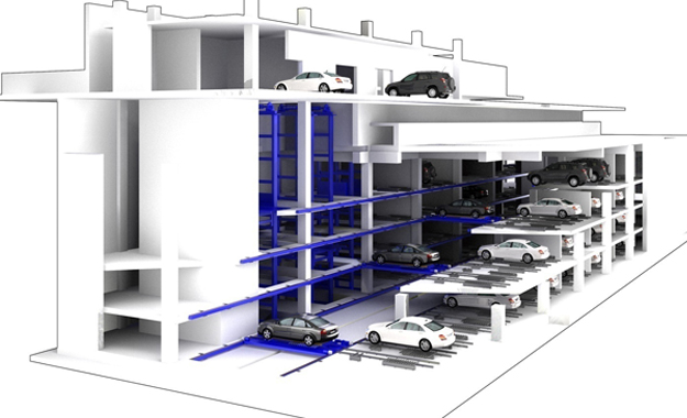 平面移動類產(chǎn)品是在同一水平層上用搬運器平面移動汽車或載車板,實現(xiàn)存取汽車的機(jī)械式停車設(shè)備,多層平面移動類停車設(shè)備還需要升降機(jī)來實現(xiàn)不同層間的升降。設(shè)備內(nèi)利用激光測距來行走定位,采用光通訊無線信號傳送,變壓變頻(VVVF)驅(qū)動和微機(jī)控制方式使整座車庫實現(xiàn)低振動、低噪聲、低成本和高效率的運行。可內(nèi)置自動升降旋轉(zhuǎn)裝置,配以先進(jìn)的導(dǎo)航指示,無須司機(jī)倒車,自動化程度高,有著其他類型車庫無法比擬的技術(shù)優(yōu)點。